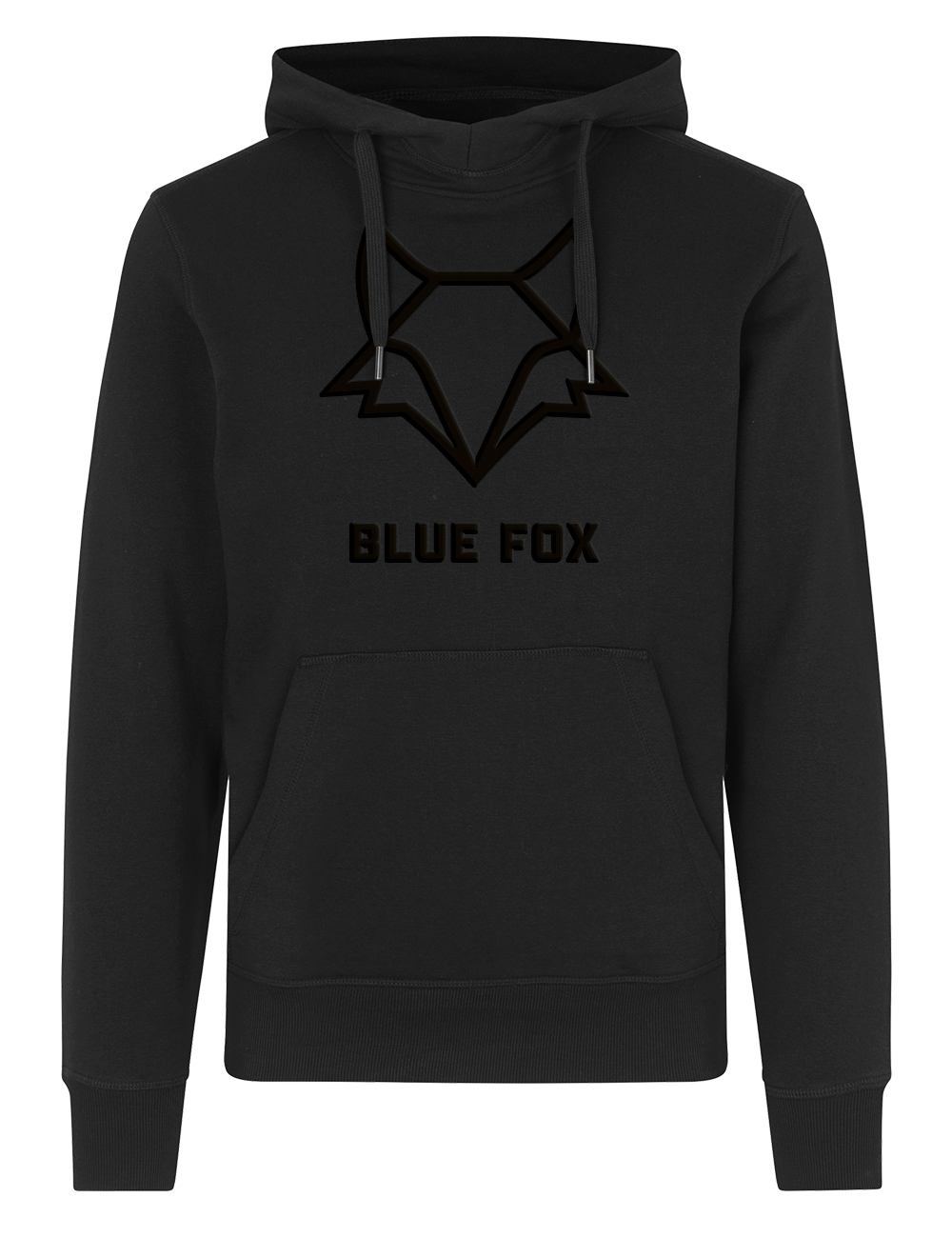 Denne hoodie er lavet med et mørkt puff tryk af ræven fra Herning Blue Fox. Trøjen er lavet i bomuld, og er som helhed lidt mere diskret, og kan bruges på arbejde, til sociale arrangementer eller noget tredje. Puff trykket på fronten giver hoodien en ekstra dimension.