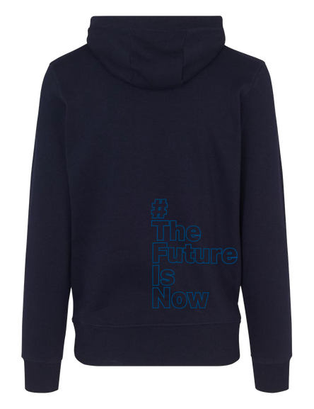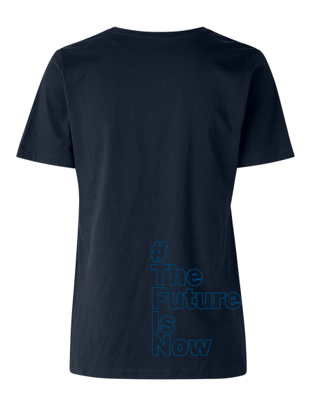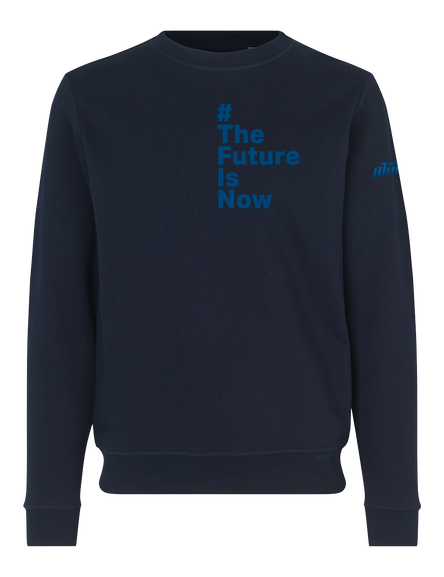 Det nye mantra, #THEFUTUREISNOW, er trykt på ryggen.