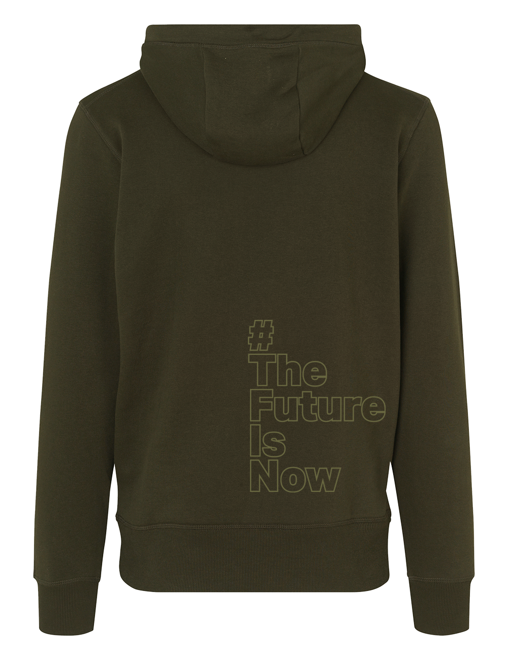 Det nye mantra, #THEFUTUREISNOW, er trykt på ryggen.