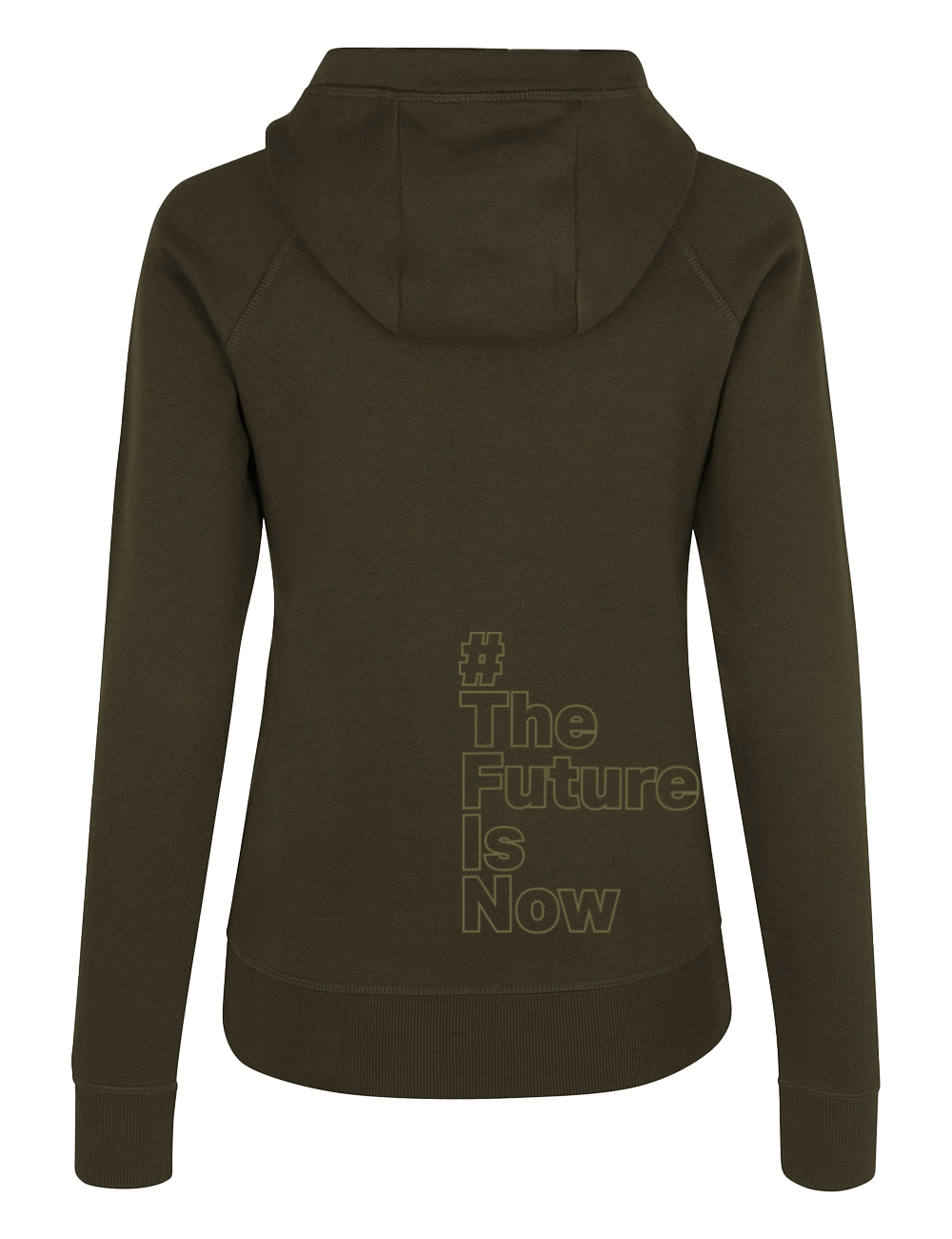 Det nye mantra, #THEFUTUREISNOW, er trykt på ryggen.