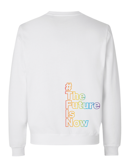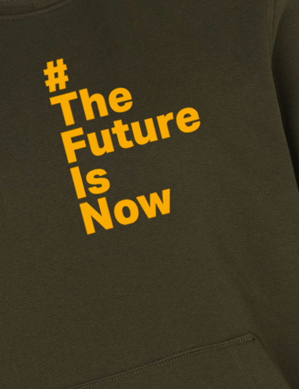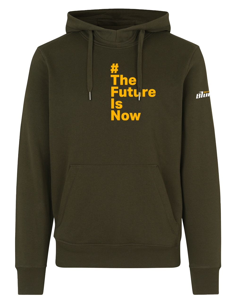 Hoodie med det nye mantra #TheFutureIsNow. Hoodie med high-cut halsafslutning, snøre i hætte og rib ved ærme og bund.
