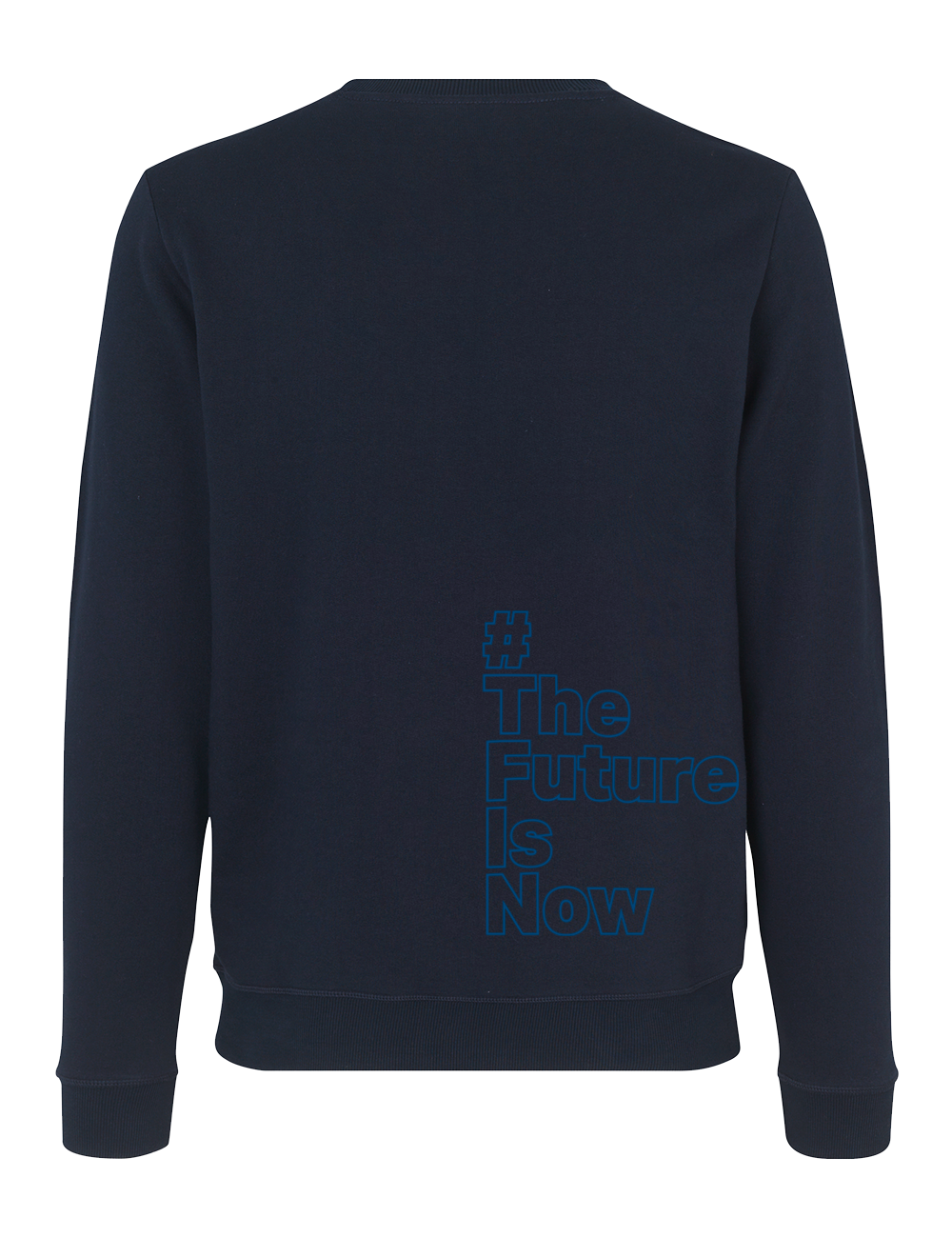 Det nye mantra, #THEFUTUREISNOW, er trykt på ryggen.