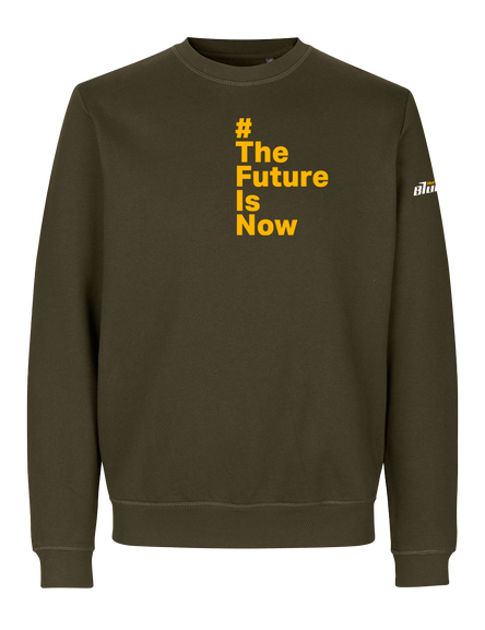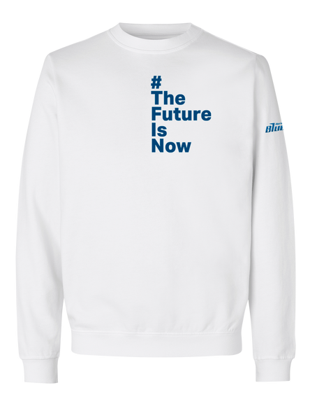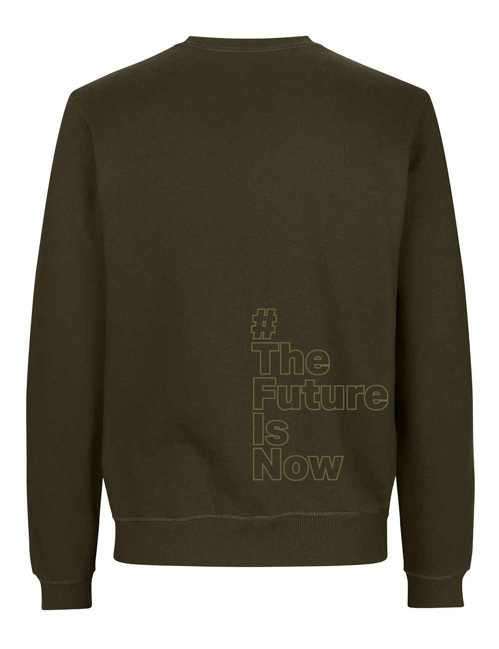 Det nye mantra, #THEFUTUREISNOW, er trykt på ryggen.