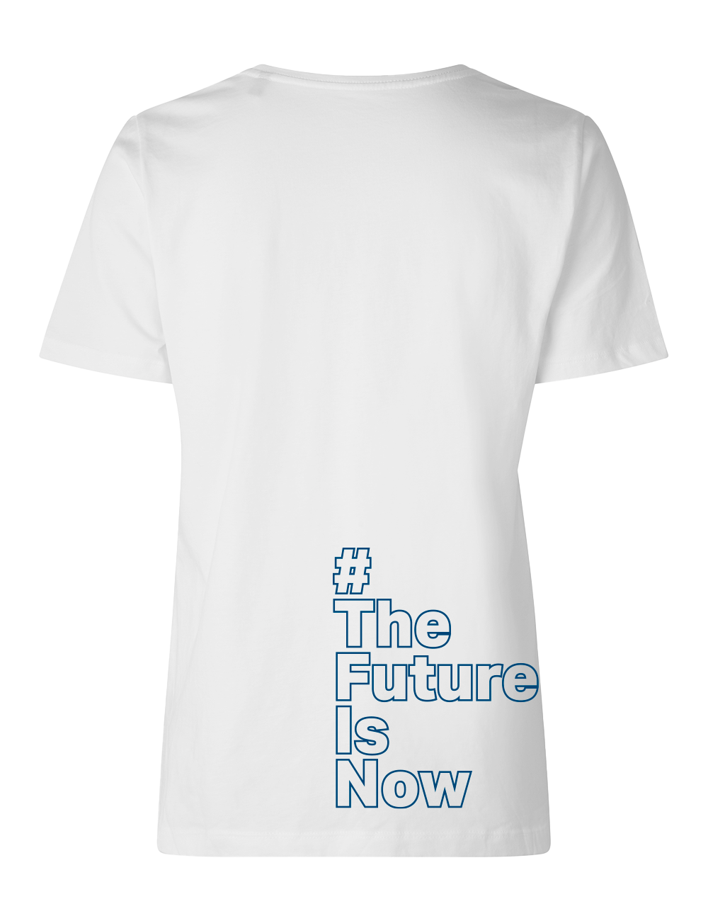 Det nye mantra, #THEFUTUREISNOW, er trykt på ryggen.