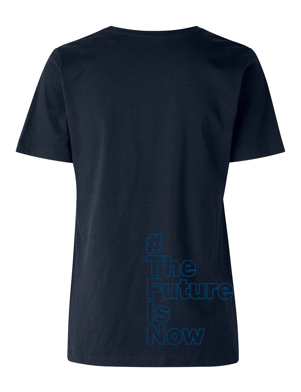Det nye mantra, #THEFUTUREISNOW, er trykt på ryggen.