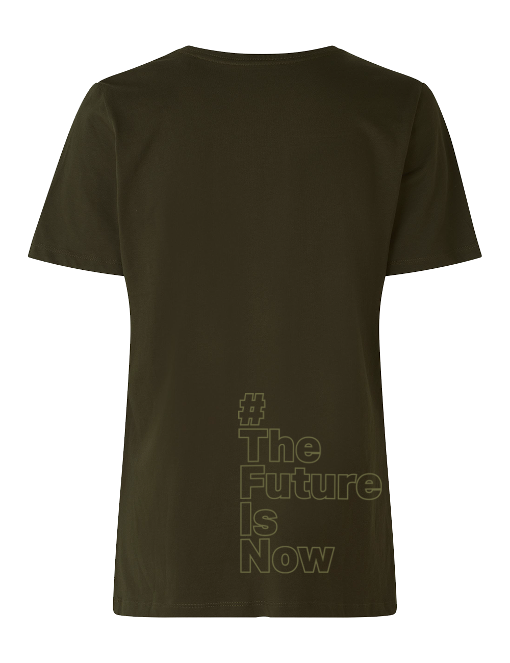 Det nye mantra, #THEFUTUREISNOW, er trykt på ryggen.