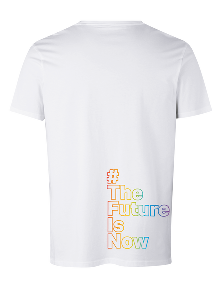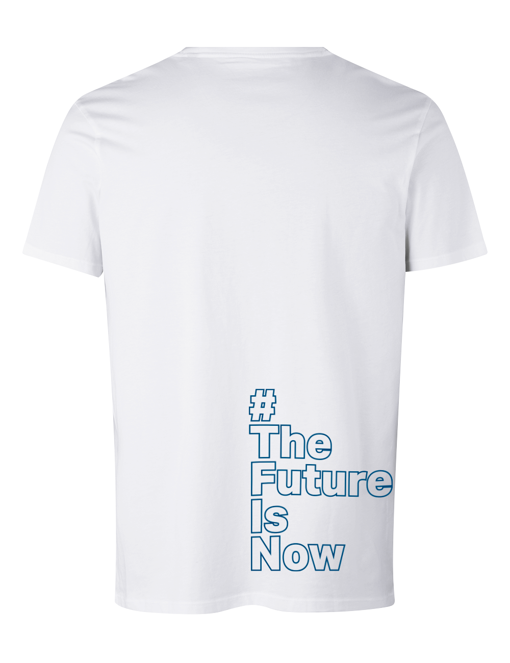 Det nye mantra, #THEFUTUREISNOW, er trykt på ryggen.