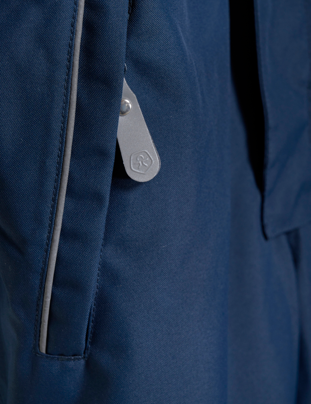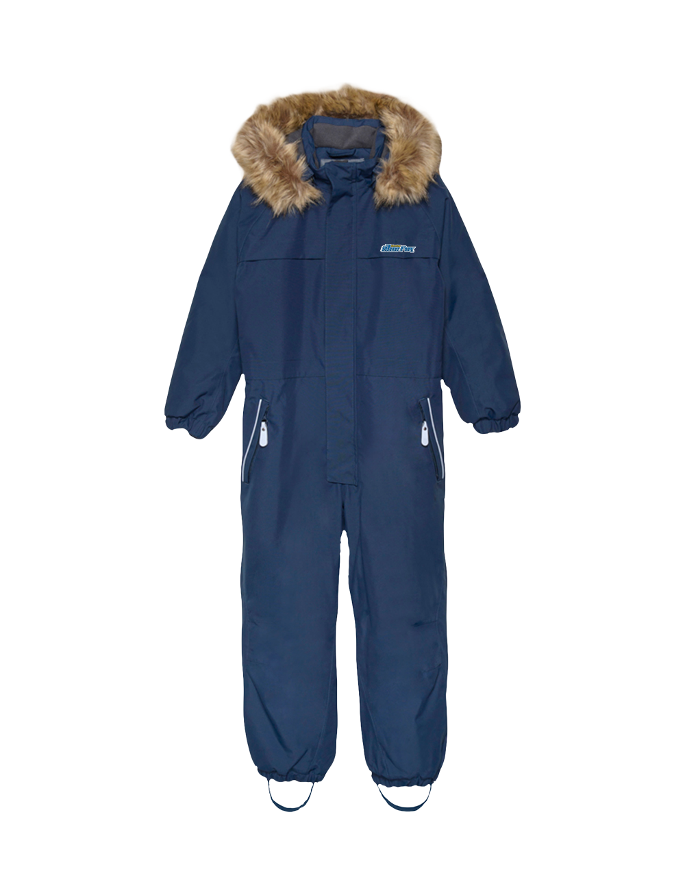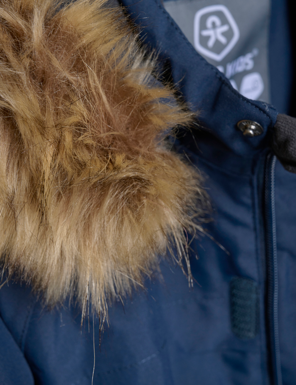 Color Kids flyverdragten har en aftagelig hætte, som sidder fast med trykknapper omkring halskraven, og den har en elastikkant på indersiden, så den sidder godt til, samt en lille skygge i toppen. Den har også en flot, imiteret pelskant, som kan tages af med skjulte trykknapper. Ærmerne og benåbningerne har elastikkanter, og der er aftagelige, justerbare gummistropper til at sætte under fodtøjet, som der medfølger én ekstra af.
