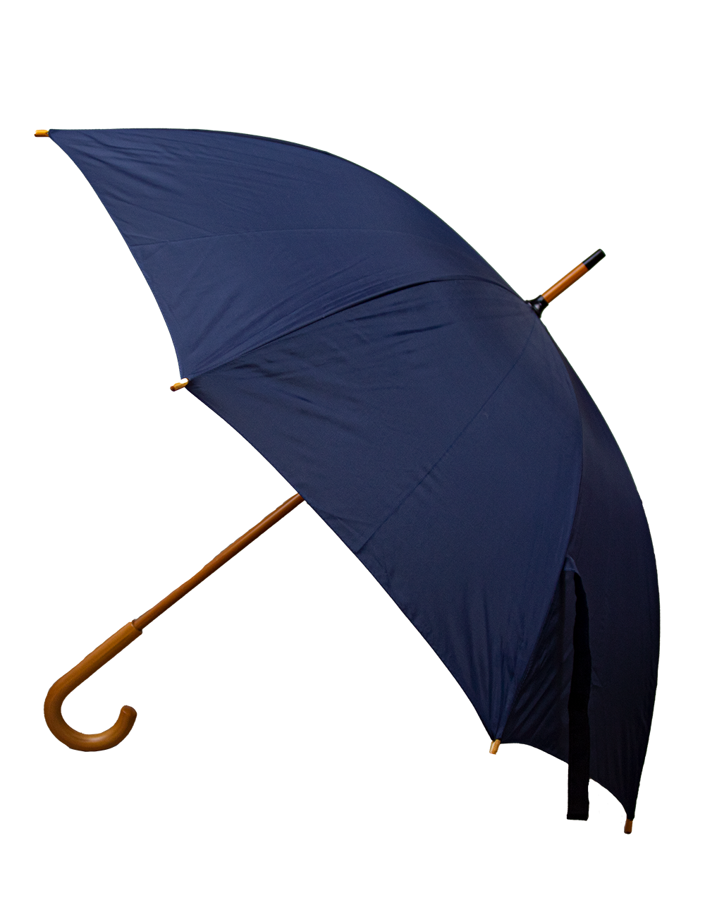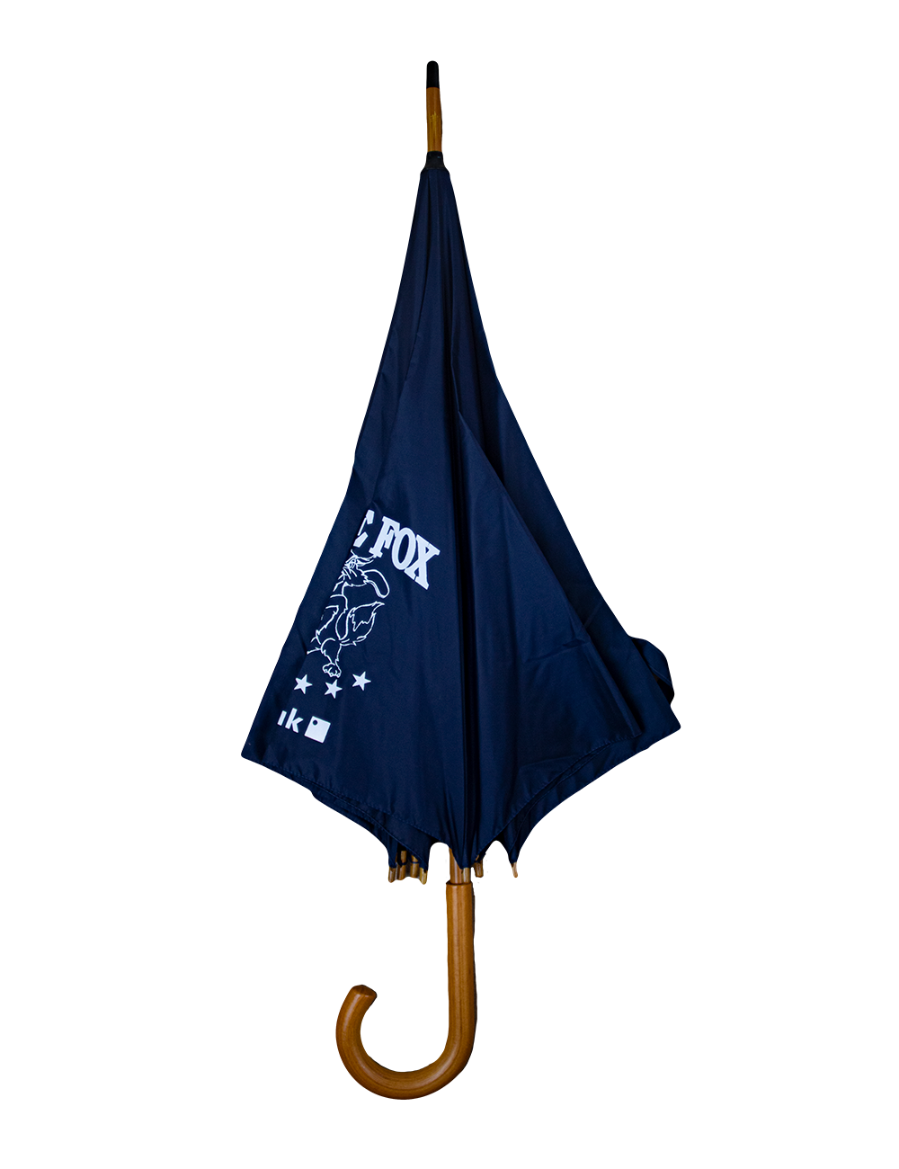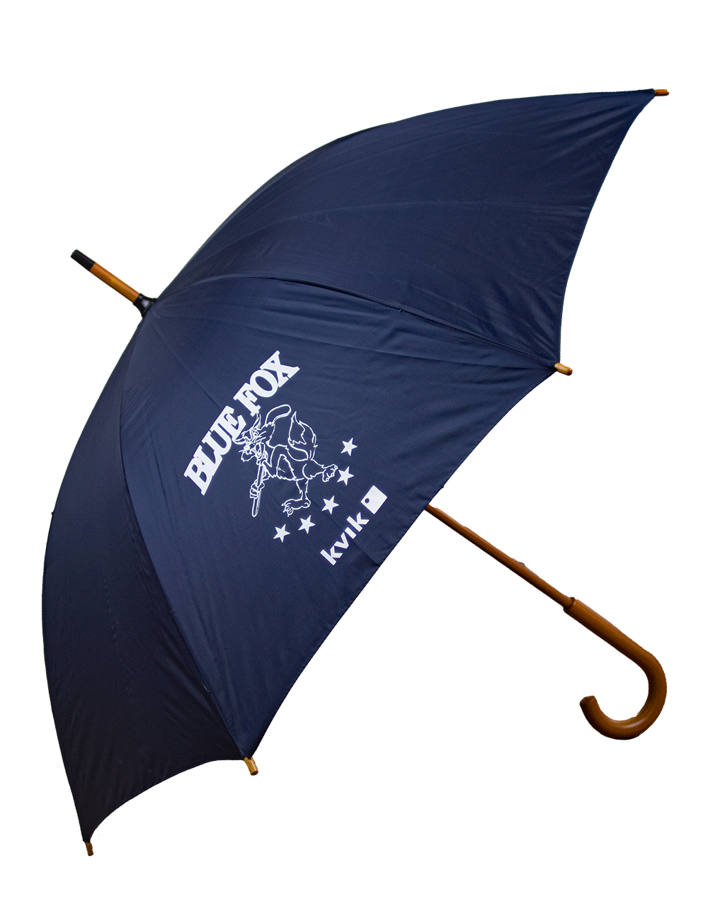 Denne paraply i navy er trykt med Blue Fox logo. Den har et behageligt håndtag, som er lavet i træ, samt velcrolukning, til når den er slået sammen.