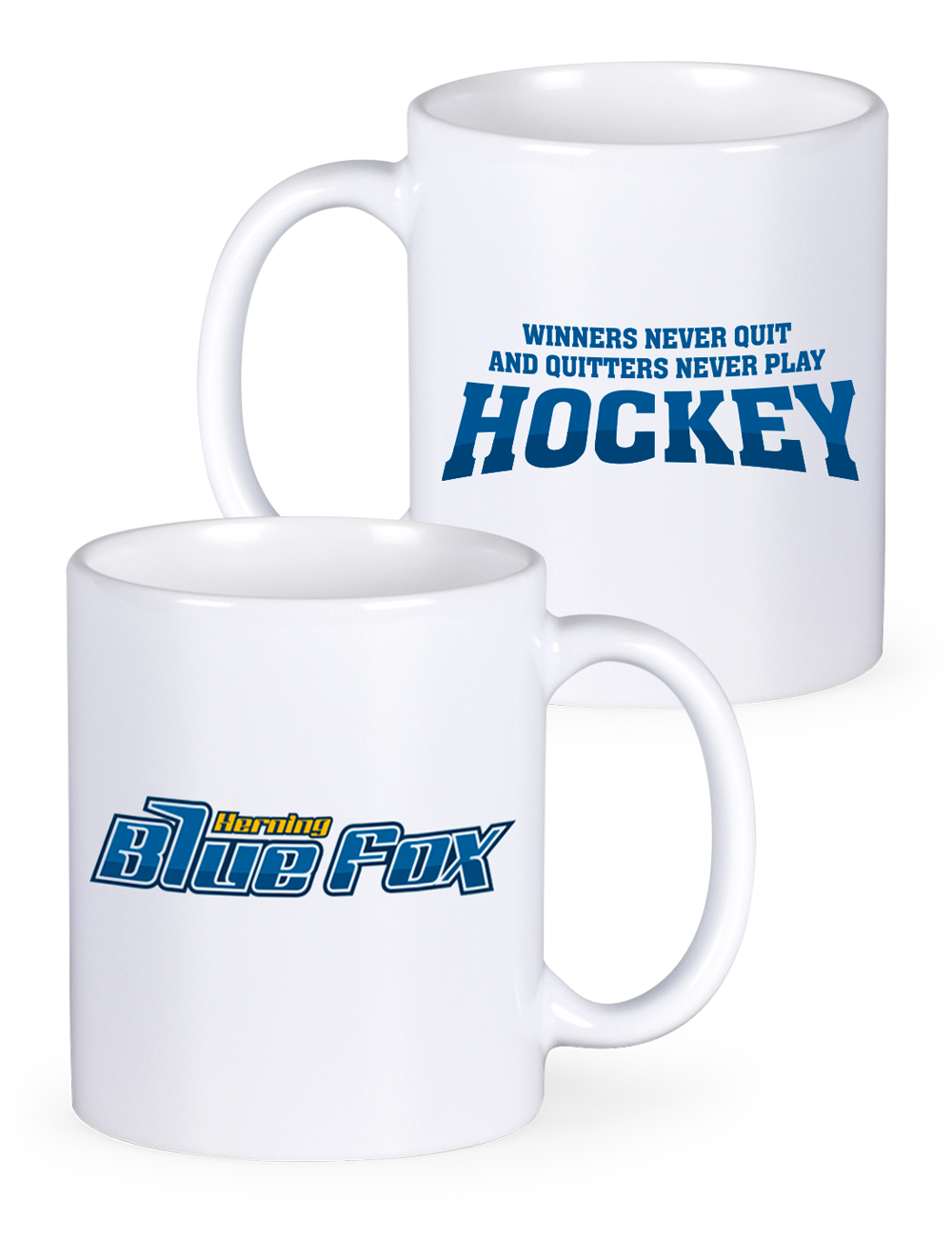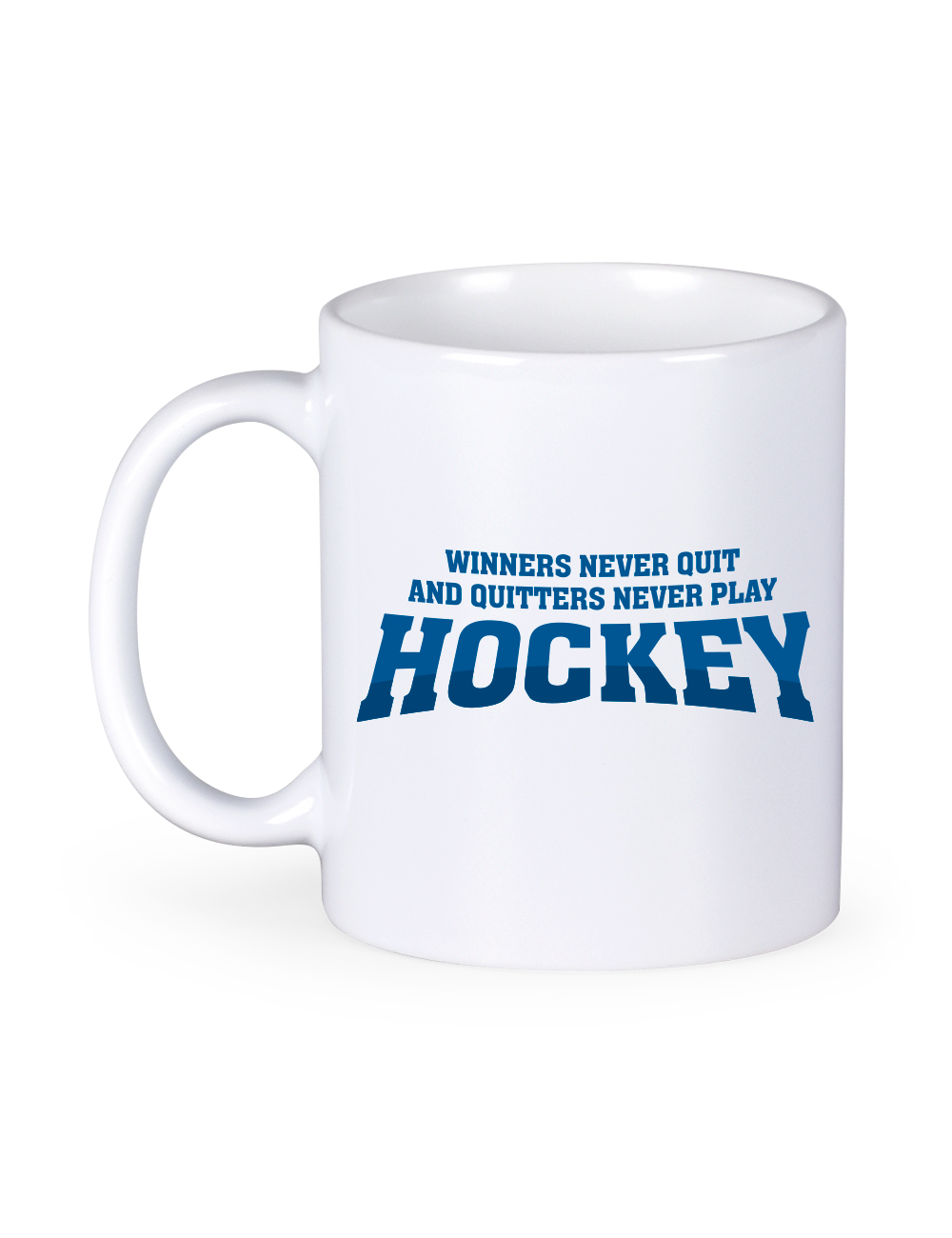 Krus med sloganet Quitters Never Play Hockey. Kruset er med hank, og er derfor ideel til varme drikke, såsom te, kakao eller kaffe.