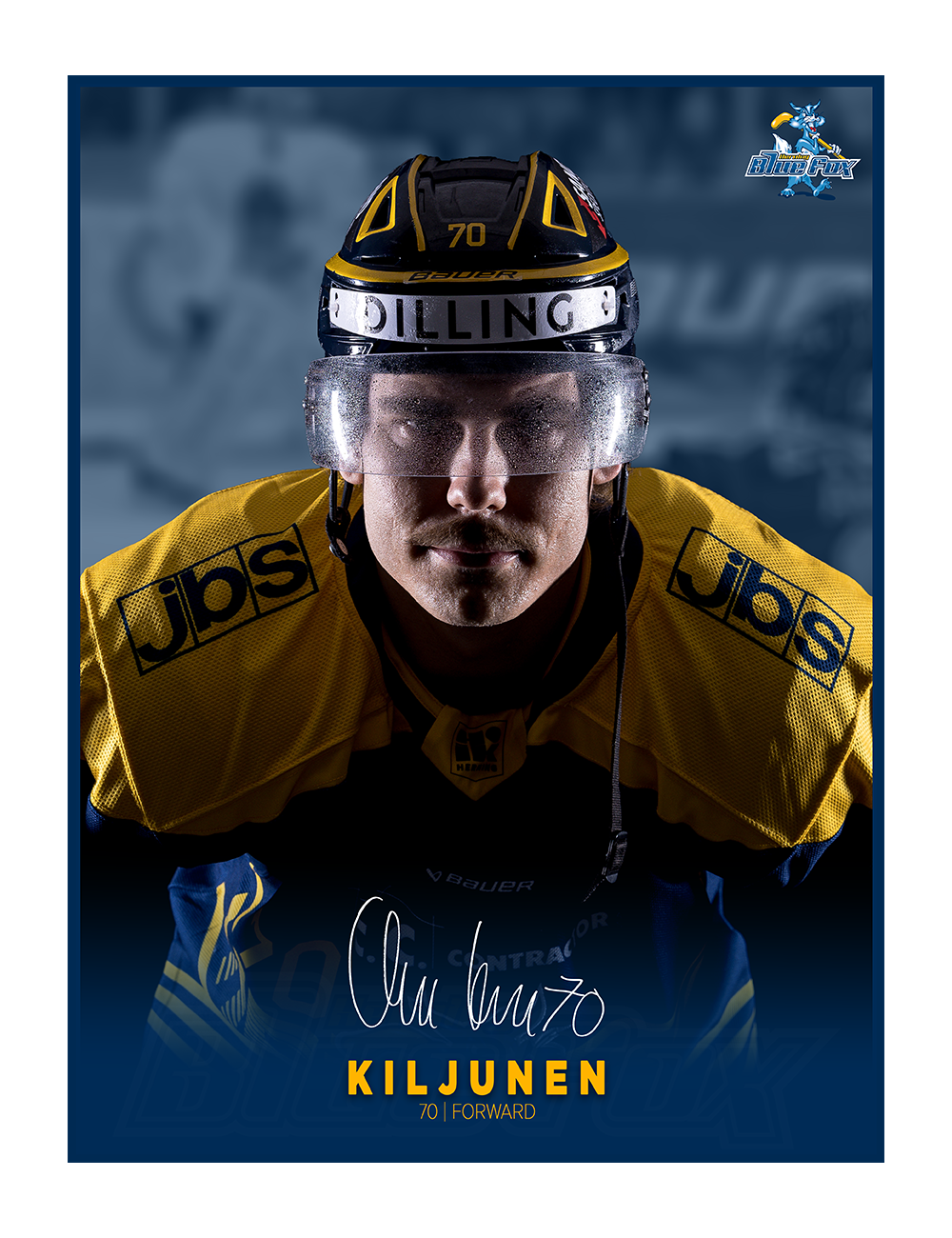 Med denne officielle Blue Fox spillerplakat kan du tage en del af kampintensiteten og holdånden med hjem. Plakaten fremhæver en af holdets profiler i et stærkt og stemningsfuldt udtryk, der emmer af fart, fokus og fight på isen.