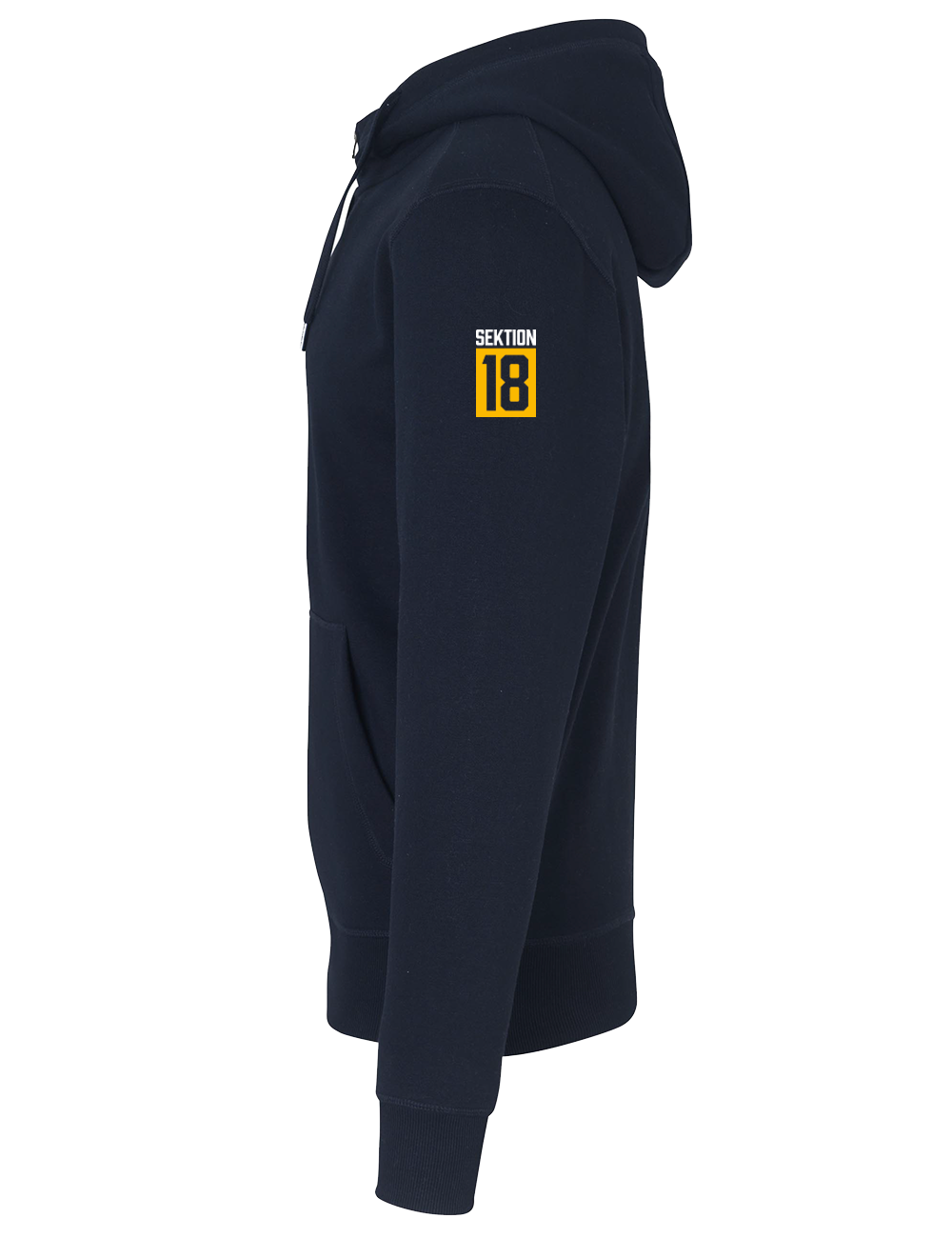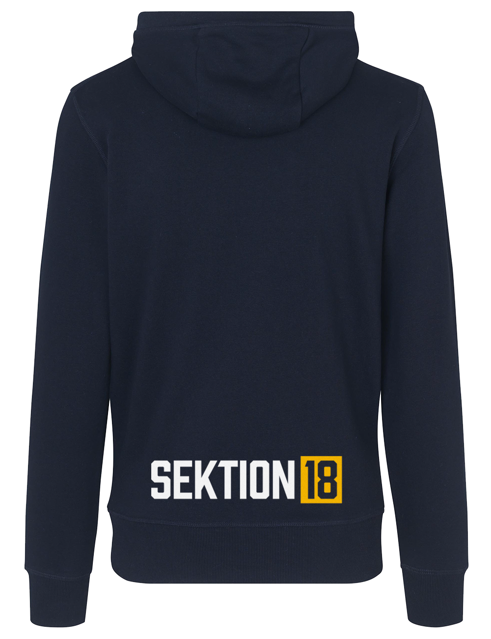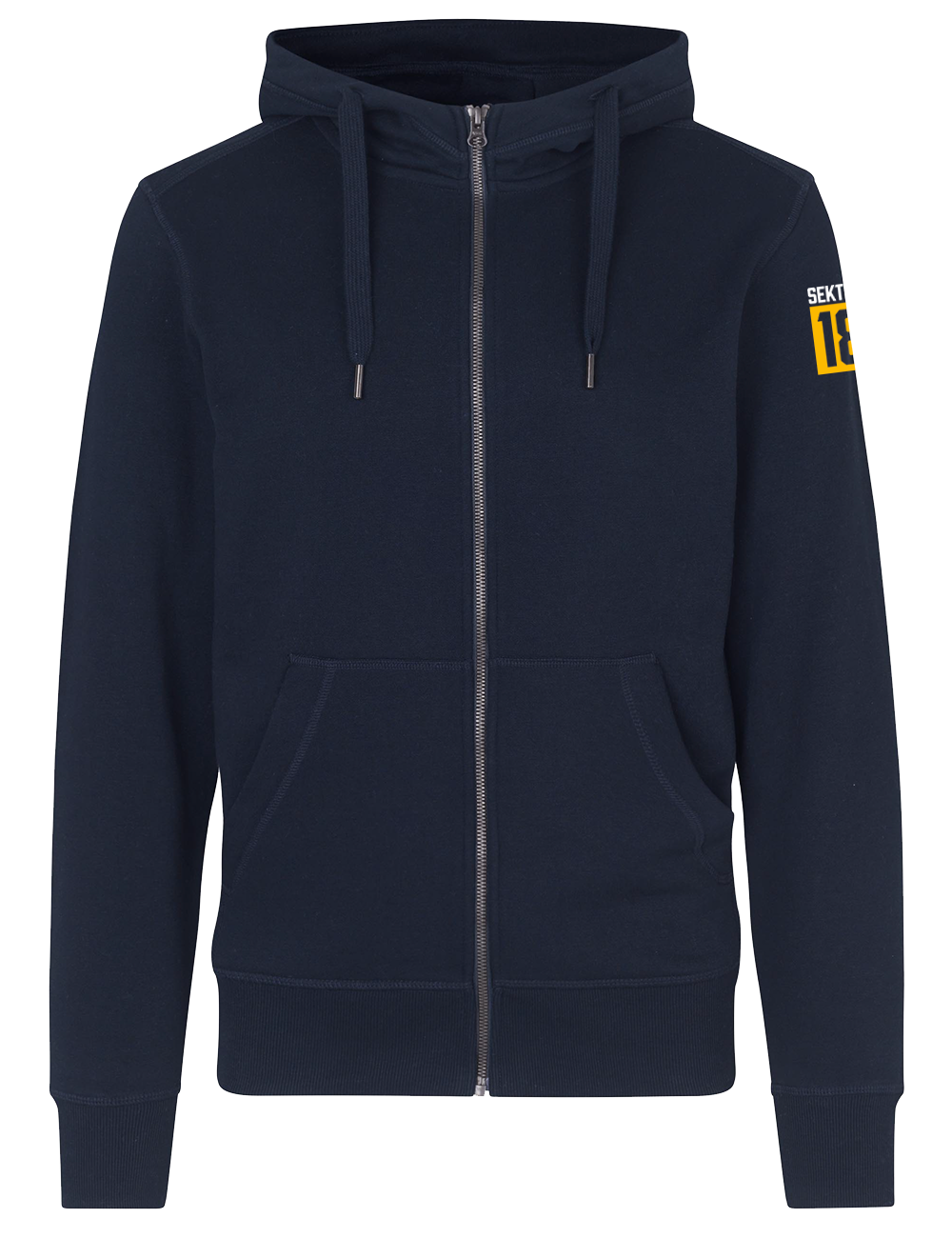 Denne SEKTION 18 hoodie er lavet med hætte, gennemgående lynlås og kængurulommer i hver side. Den er lavet i en kraftig kvalitet, snøre i hætte og rib ved ærme og bund.