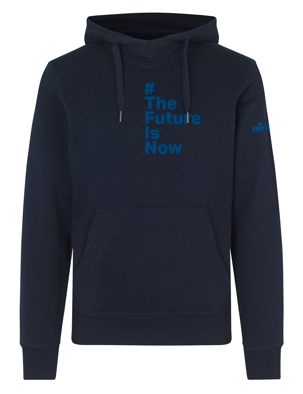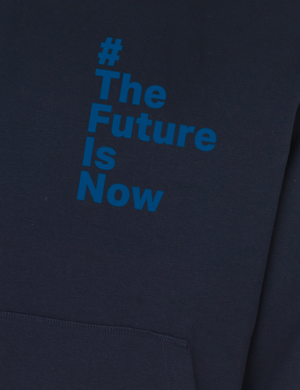 Hoodie med det nye mantra #TheFutureIsNow. Hoodie med high-cut halsafslutning, snøre i hætte og rib ved ærme og bund.